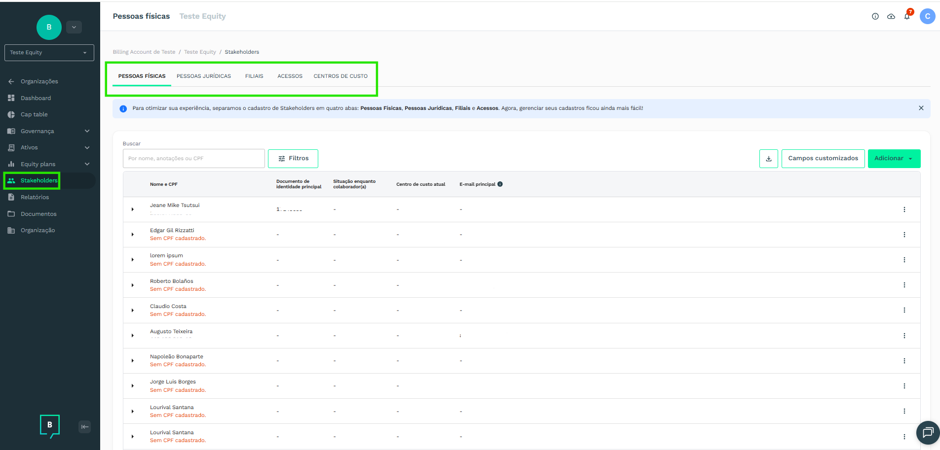 Benefício: Cadastro correto de stakeholders pessoa jurídica.