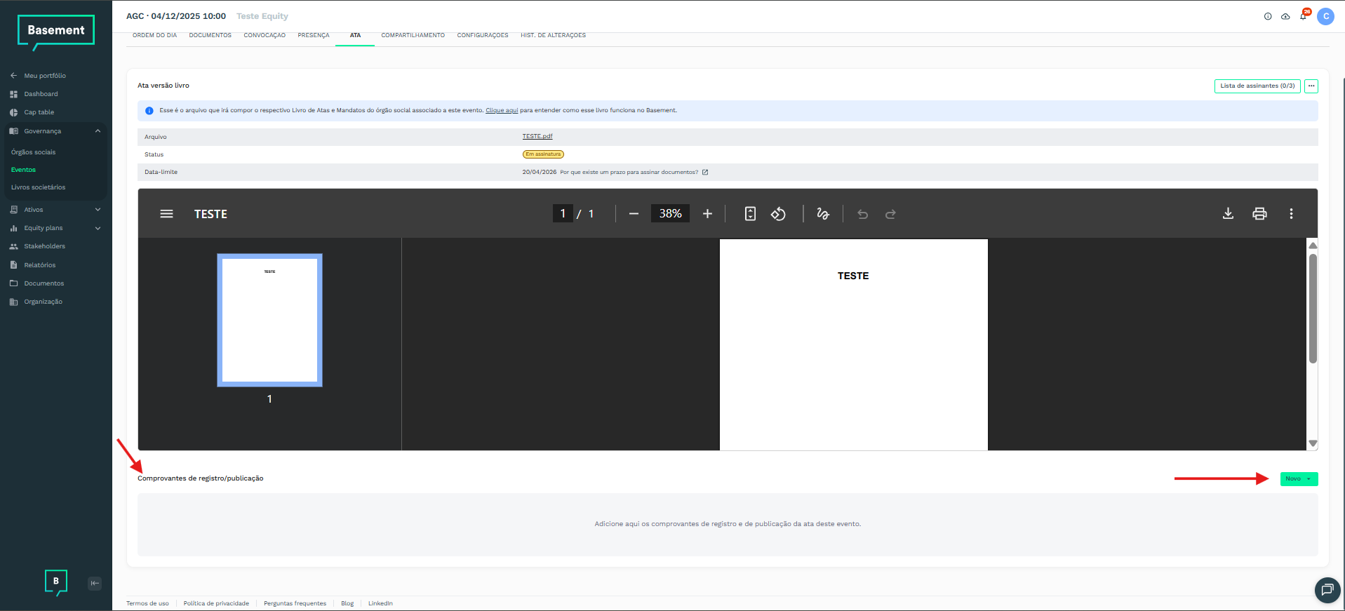 Para subir o registro/autenticação pela junta comercial, a depender das configurações de requisitos do evento (clique aqui para saber mais sobre configuração de eventos), logo abaixo da sessão da ata, você vai encontrar a subseção Comprovantes de registro/publicação.