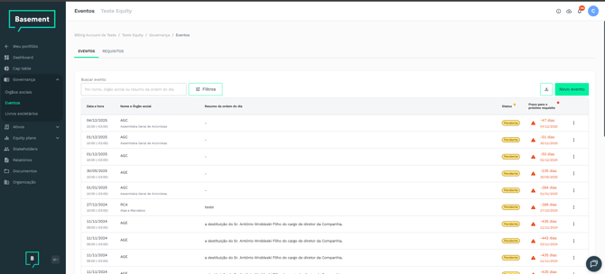 Na visão de administrador, navegue até a página de eventos pelo caminho Governança > Eventos. Nessa página estarão todos os eventos societários da empresa registrados no Basement, com data de realização, nome, resumo e status. Clique nos três pontos à direita da linha do evento que deseja editar para abrir um menu adicional com as opções Ver mais, Editar e Excluir. Clicando em Ver evento, o evento será aberto em uma nova aba do navegador.