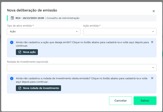 Preencha o formulário com os dados da deliberação e selecione a classe de ação que será emitida.
