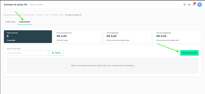 Após criar a deliberação, é necessário criar as operações de subscrição para cada acionista.