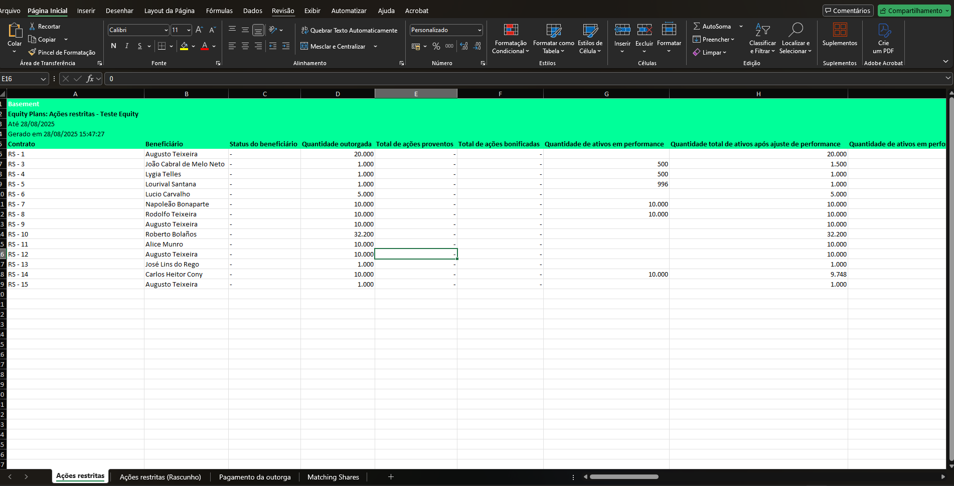 - Relatório de ações restritas: Consolida a lista de contratos de ações restritas e suas principais informações. Para acessar, vá em Relatórios > Equity plans > Ações restritas e clique em Exportar
