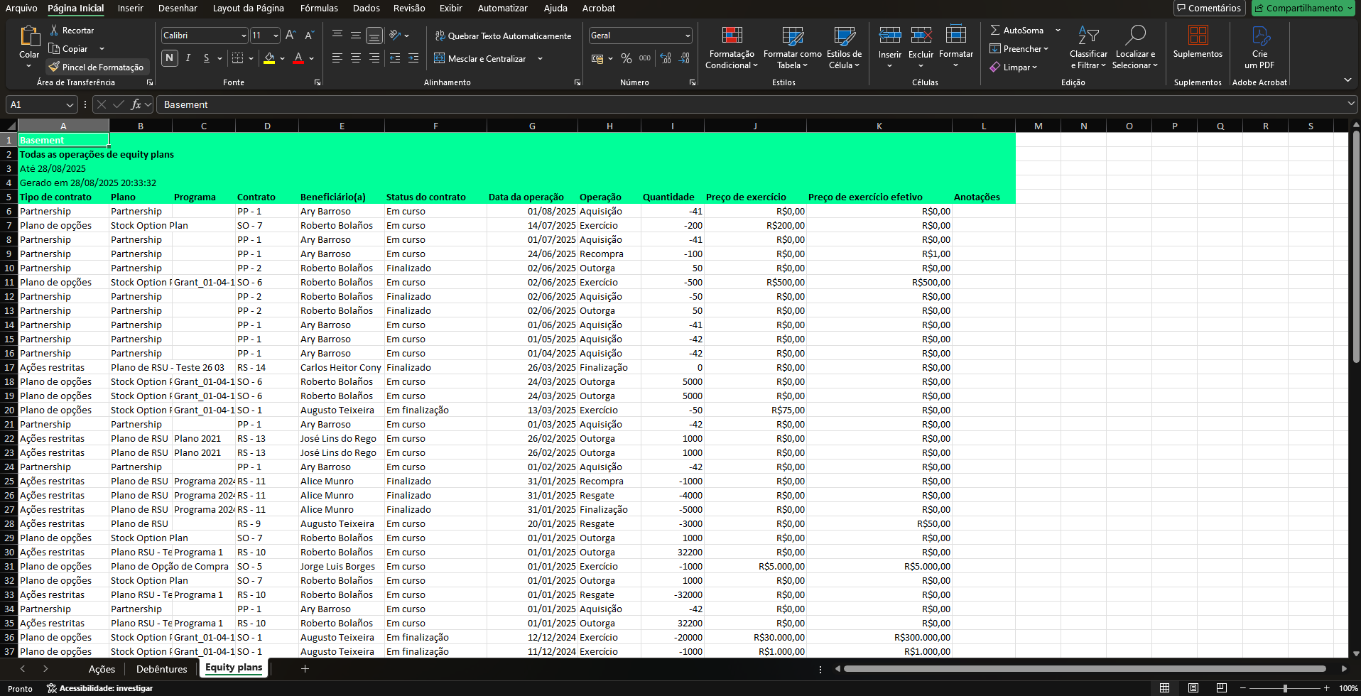 Na seção Equity plans é possível registrar e gerenciar os planos de ações restritas desde a outorga, até a manutenção dos contratos (atualização de informações, upload de documentos relacionados, operações), extração de relatórios que consolidam informações dos planos e contratos e a disponibilização das principais informações para os beneficiários.