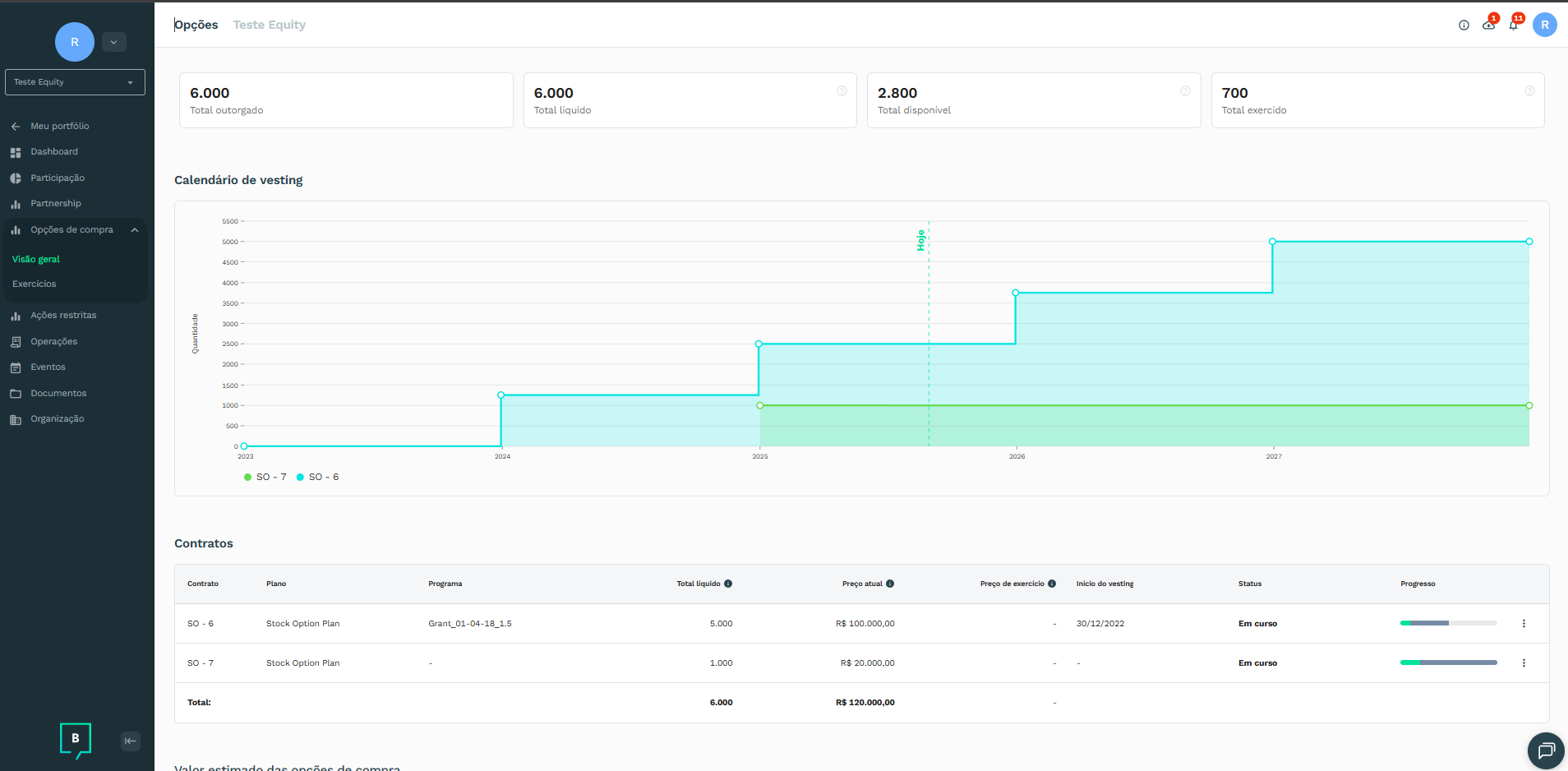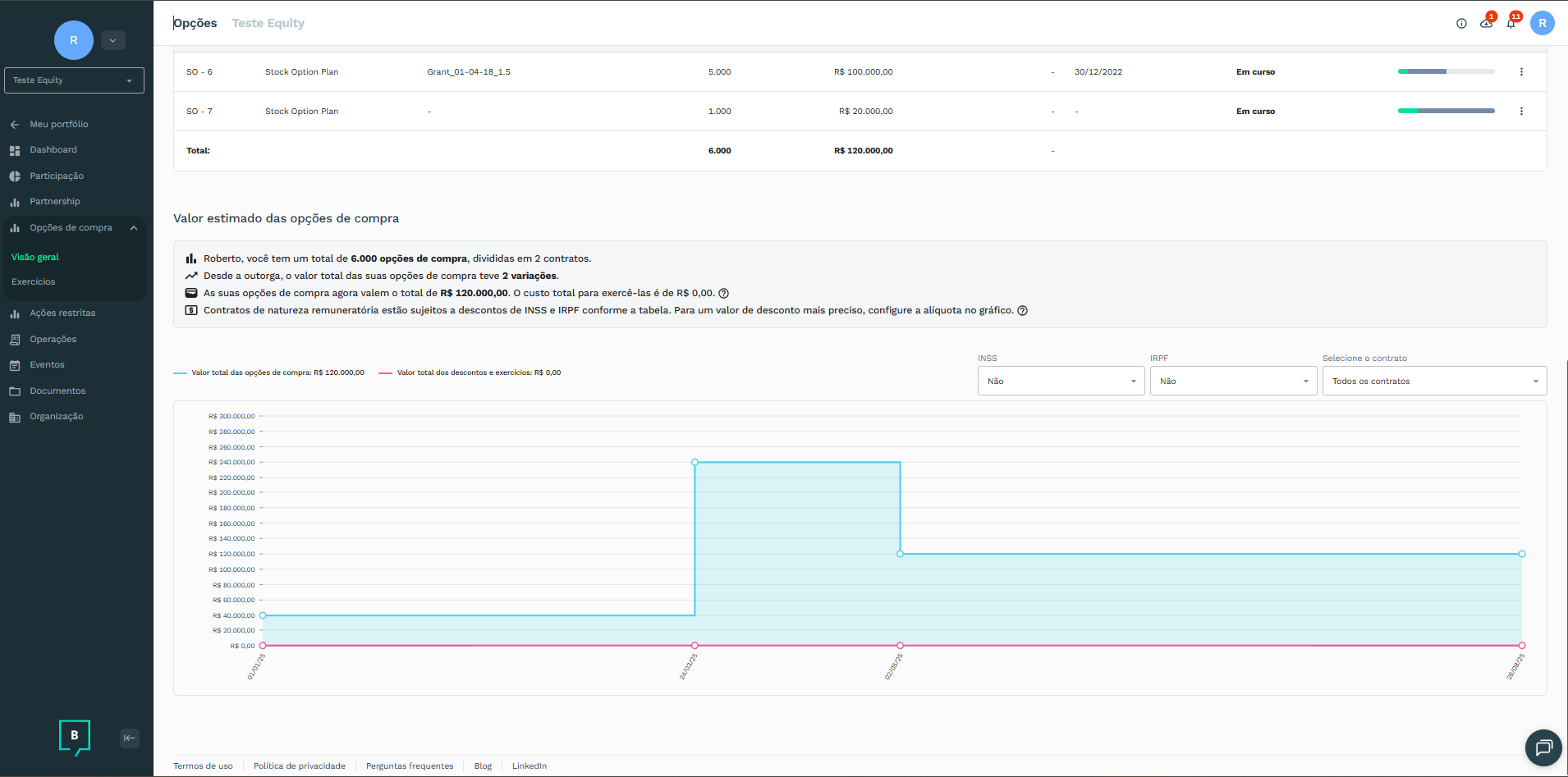 - Gráfico de Valor estimado dos contratos: Visualização gráfica da valorização dos contratos ao longo do tempo, consolidando o valor do contrato segundo preço da ação e os descontos e pagamentos a serem realizados