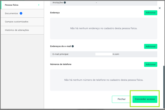 Para conceder acesso, basta clicar na linha do stakeholder e então, clicar em Conceder acesso . O botão só fica visível para os stakeholder que tiverem um e-mail principal cadastrado, para o qual será enviada uma mensagem com um token de login e as instruções para o primeiro acesso.