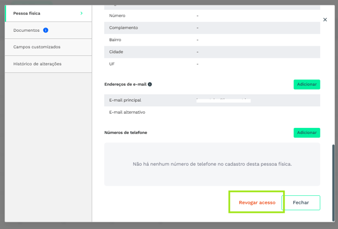 Caso seja necessário remover o acesso do stakeholder da plataforma por algum motivo, o fluxo é o mesmo, porém o botão estará como Revogar acesso.