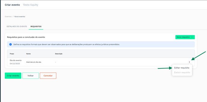 Mesmo após o evento criado, é possível editar os requisitos, bem como excluir ou incluir.
