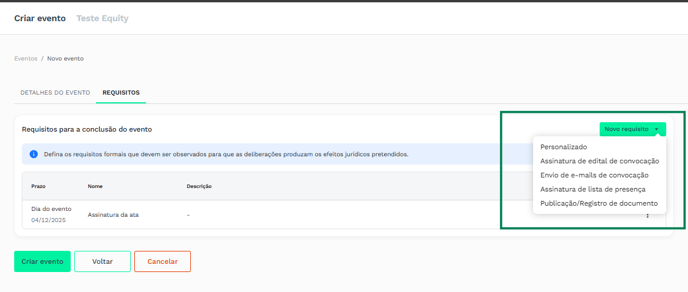 Agora é possível definir quais requisitos que vão fazer parte do seu evento. E é o cumprimento desses requisitos que vão definir o status do seu evento para Concluído.