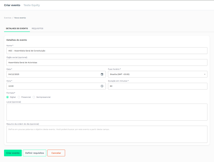 Após preencher os detalhes básicos do evento, clique Definir requisitos, para seguir pra próxima tela. Esta seção permite adicionar requisitos formais que devem ser cumpridos.