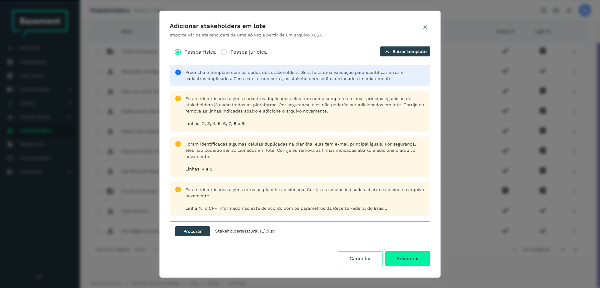 Na mesma janela na qual os modelos são baixados, há um campo para selecionar um arquivo preenchido. Clique nele para selecionar o arquivo salvo no passo anterior e depois clique no botão Adicionar. Ao processar o arquivo, serão feitas verificações para conferir: (i) se os campos obrigatórios foram preenchidos - nome completo, no caso de pessoa física, e nome e razão social, no caso de pessoa jurídica; (ii) se os dados inseridos nas colunas de nome, CPF, CNPJ e País de endereço são válidos; (iii) se há linhas duplicadas nas colunas de nome, razão social, e-mail principal, CPF ou CNPJ; e (iv) se os dados inseridos nas colunas de nome, razão social, e-mail principal, CPF ou CNPJ são idênticos ao de pessoas que já estão cadastradas.