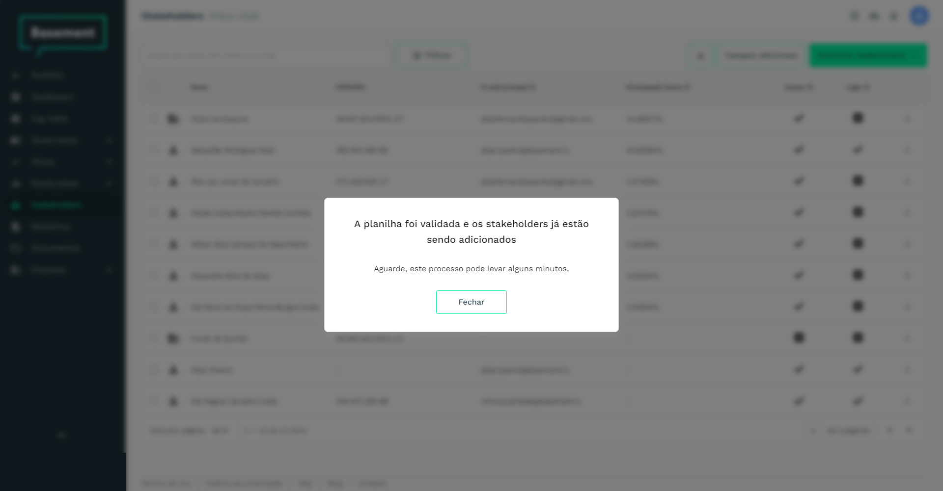 Se estiver certo, os stakeholders serão adicionados imediatamente e uma mensagem de confirmação será exibida na tela. Dependendo da quantidade, o processamento dos dados pode levar alguns minutos. Portanto, não se preocupe se o número total exibido na tabela não estiver correto. Durante esse processo, não é necessário manter a página aberta.