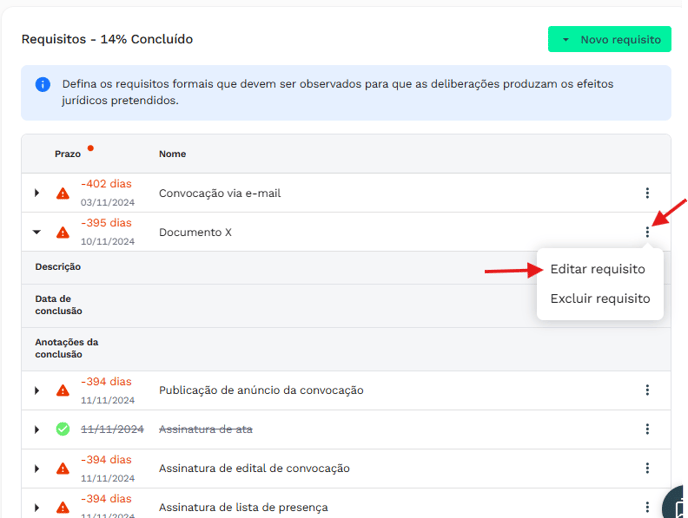 É possível personalizar algum outro requisito que considere importante. Para que ele seja considerado cumprido, é clicar nos 3 potinhos ao lado dele, em seguida