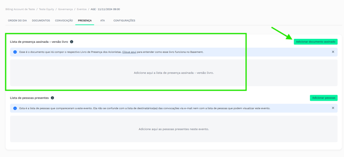 3. Assinatura da lista de presença (sempre obrigatório): Deve-se anexar a lista de presença assinada na sessão PRESENÇA , em "Lista de presença assinada - versão livro"