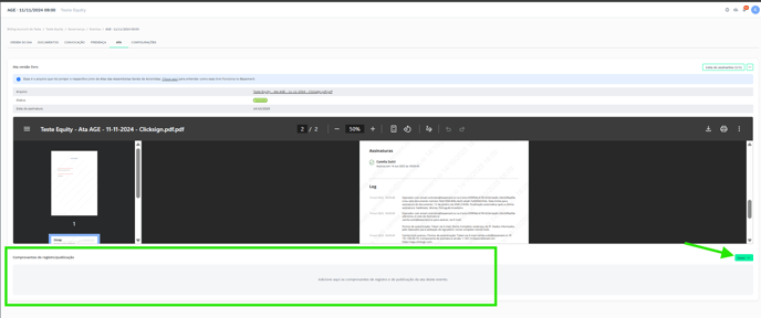 4. Publicação/registro de documento: Deve-se anexar o comprovante da publicação/registro de acordo com a seleção feita na configuração desse requisito (podendo ser um DCC, um balanço patrimonial, registro na junta comercial entre outros), abaixo da própria ata: