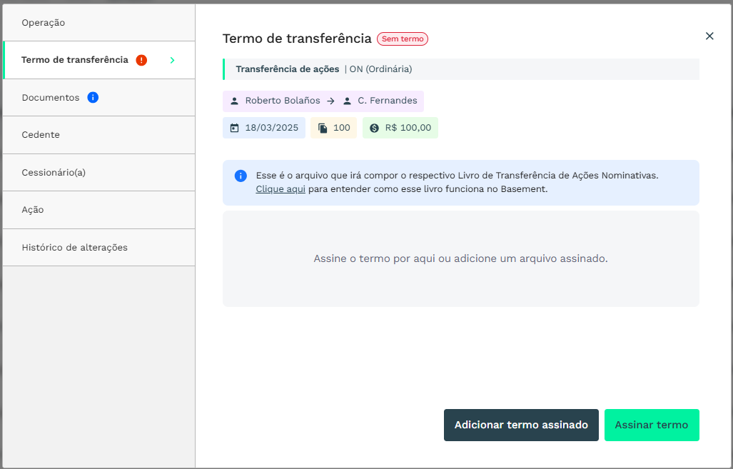 Nesta aba está todo o fluxo de criação, visualização, edição e exclusão do termo de transferência da respectiva operação, que será lavrado no respectivo Livro de Transferência de Ações Nominativas ou no Livro de Transferência de Debêntures Nominativas. Esta aba não se aplica para transferências de outros tipos de ativo. Clique aqui para acessar o artigo referente a termos de transferência.