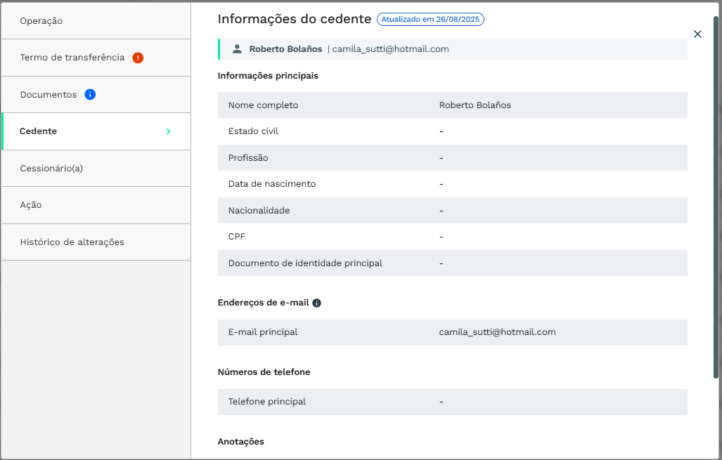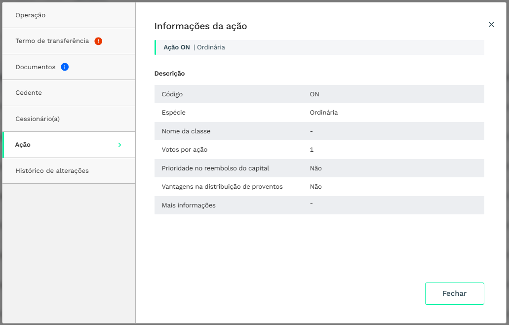Nesta aba está um resumo com as principais informações do stakeholder que transferiu as ações.